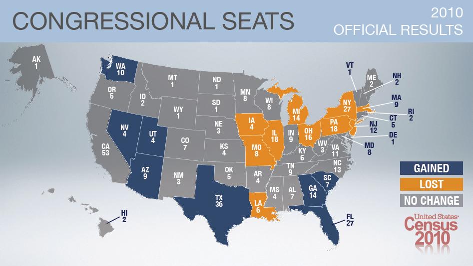 Census numbers dictate Congressional representation. Since the total number of representatives stays the same at 435, it’s the distribution that changes.