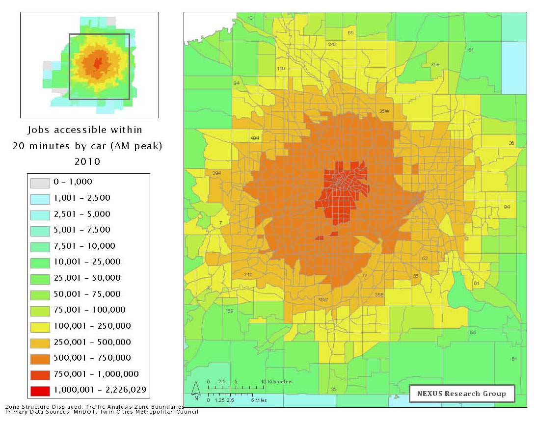 A study recently released by the University of Minnesota presents an interesting alternative to the TTI’s metrics. UMN Transportation Engineering Professor David Levinson recently analyzed metropolitan commuting according to a very different criterion: accessibility, or “the ease of reaching desired destinations.”
