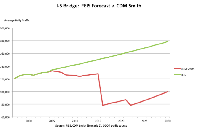 Despite the recent setback, the new version has many of the same flaws that made the previous proposal so unpopular. Basically, the expense can’t be justified. Aaron Renn at the Urbanophile points to a recent report by economist Joe Cortright, who flagged an analysis of the CRC for investors by project consultant CDM Smith. Those forecasts, obtained by Cortright through a public records request, predict that traffic on the bridge will actually decline after it is built and tolled — an outcome that is completely at odds with what Oregon DOT claimed in its environmental impact statement.