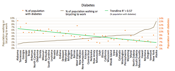 About 9 percent of Americans have diabetes, but the incidence varies greatly between different places. Diabetes tracks closely enough with walk and bike commute rates that the Alliance and other researchers have concluded there’s a strong correlation.