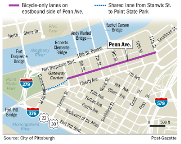 Two bike lanes, one in each direction, will occupy the eastbound side of Penn Avenue, replacing the existing traffic lane from Stanwix Street to 11th Street. Eastbound vehicles would be rerouted to Fort Duquesne Boulevard and Liberty Avenue, which are parallel to Penn. Westbound traffic and on-street parking would not change.