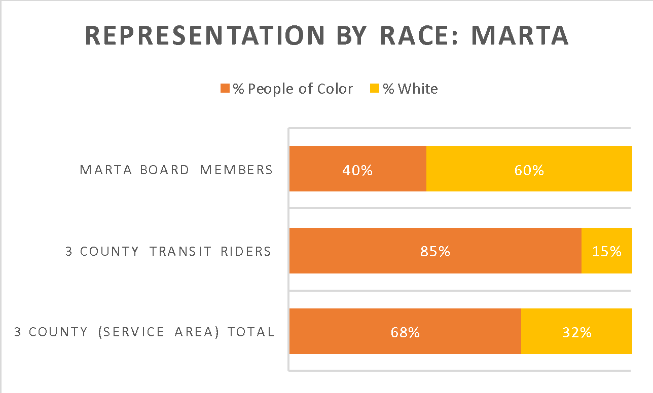 What would change if more diverse voices were at transit decision making tables, shaping policy and investment? If more women were at the table, we might hear more about the need for service in off-peak hours to accommodate service and domestic work. We might learn that free transfers are completely essential for the multi-leg trips that work, school commuting, and errands require. We might prioritize lighting, visibility, and real-time information at bus stops to help improve safety. If more people of color were at the table, we might hear stronger challenges to expensive new rail projects that tilt the scales away from investment in bus service and amenities in communities of color where riders live. We might have a more comprehensive conversation about policing on transit, and what “safety” means in practice. If more people from the disabled community were on transit boards, their colleagues might grasp the gravity of inaccessibility and prioritize requisite changes.