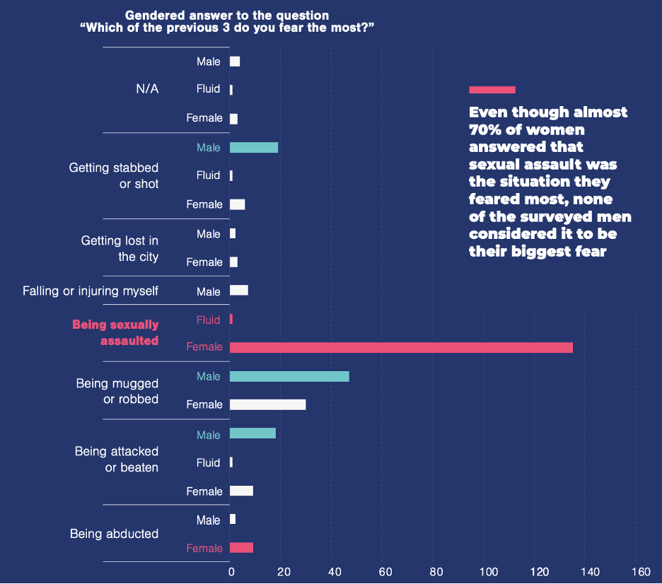 The results were overwhelmingly similar from women-identified respondents around the globe: a shocking 30 percent of women responded that they “always” or “very frequently” choose other modes to get around the city, or when possible, skip going out altogether, simply because they feel unsafe walking. And a staggering 70 percent of all women surveyed listed the possibility of sexual assault as their number one worry.