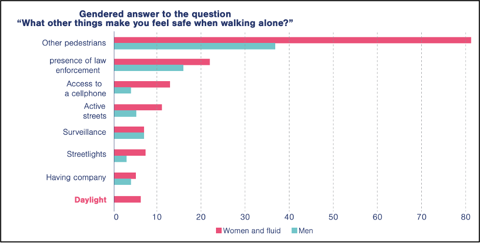 “The only two questions that don’t actually have a gender differential response were about the elements of urban design that people need to feels safer, and the behaviors that they adopt when they feel unsafe,” said Juliana Vélez-Duque, who co-authored the paper. “Both men and women use these behaviors when they feel unsafe; longer routes, crossing the street when they see someone suspicious. Both do that, but women do it far more often.”
