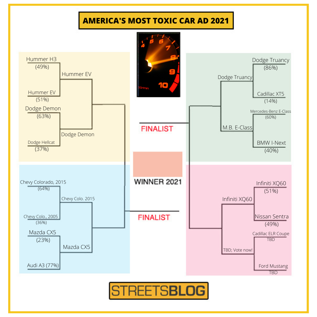 But to understand why, exactly, this round’s contenders are so corrosive to our transportation culture, we’re bringing in an expert: Tom Flood, advertising and marketing pro, sustainable transportation advocate extraordinaire, and one of our very favorite Twitter follows. In fact, he’ll be providing commentary on all four semifinal bouts.