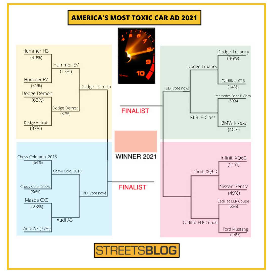 This Talladega Nights–themed Dodge ad raced away with the semi-finals win, beating a Cadillac XT5 ad by a punishing 86 to 14 percent margin — despite the fact that it doesn’t even feature the name of the car it’s trying to sell (which is why we’re calling it the Dodge Truancy.) Both spots featured some pretty questionable images of adults speeding with their kids in the car, but that was only the beginning of this horrific pile-up of toxic car culture stereotypes.