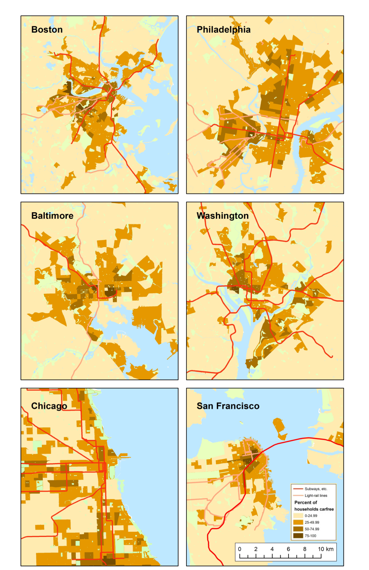 As a geographer, Winters didn’t analyze what the country’s car-light neighborhoods have in common, but advocates who responded to his post were quick to point out some similarities. In general, tracts with light rail lines tended to have higher concentrations of households without automobiles, though in some cities, like Baltimore, some of the most heavily transit-dependent areas weren’t being served by rail at all — consistent with recent research that shows that local transportation leaders are failing to prioritize convenient shared options for the Charm City residents who need them most.