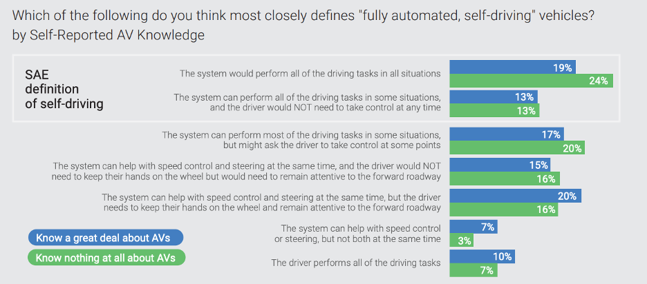Respondents were asked to choose which of seven definitions of best matched their understanding of the term “fully automated, self-driving vehicle,” and then graded based on whether their answers corresponded to the “SAE definition of self-driving.” The answers that were deemed to be correct correspond to the definitions of SAE J3016 levels four and five (driver not responsible for vehicle driving at all). Incorrect answers roughly correspond to SAE Level 0-3 (driver participates in some or all driving tasks).