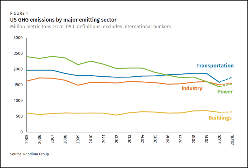 According to preliminary estimates from the Rhodium Group, transport sector emissions shot up 10 percent between the 2020 and 2021, making it once again the country’s single largest driver of climate change, despite the fact that travel continued to be suppressed by the pandemic for much of the year. That puts the sector at roughly two-thirds of pre-quarantine levels, even as emissions levels in other areas of the economy rose far more gradually (see chart below).