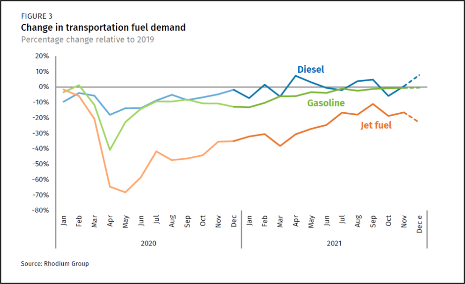 By the end of 2021, experts estimate that demand for gasoline — a metric the Rhodium Group says is “indicative of demand for on-road passenger travel” — had nearly climbed to 2019 levels, while diesel demand actually exceeded that year’s peak by 0.4 percent, driven by historic consumer demand that pushed the shipping industry to its brink.