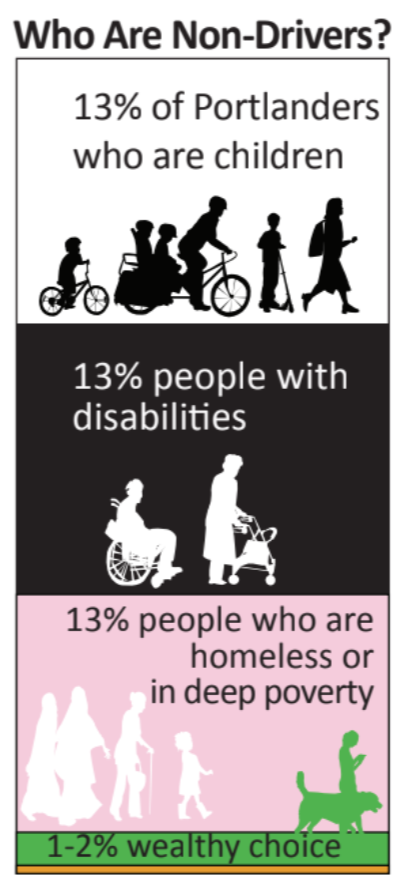 Tuttle estimates 40 percent of Portlanders are non-drivers, including children, people with disabilities, and people who can’t afford to drive. Just one to two percent of city residents are what she calls “privileged non-drivers of choice.”