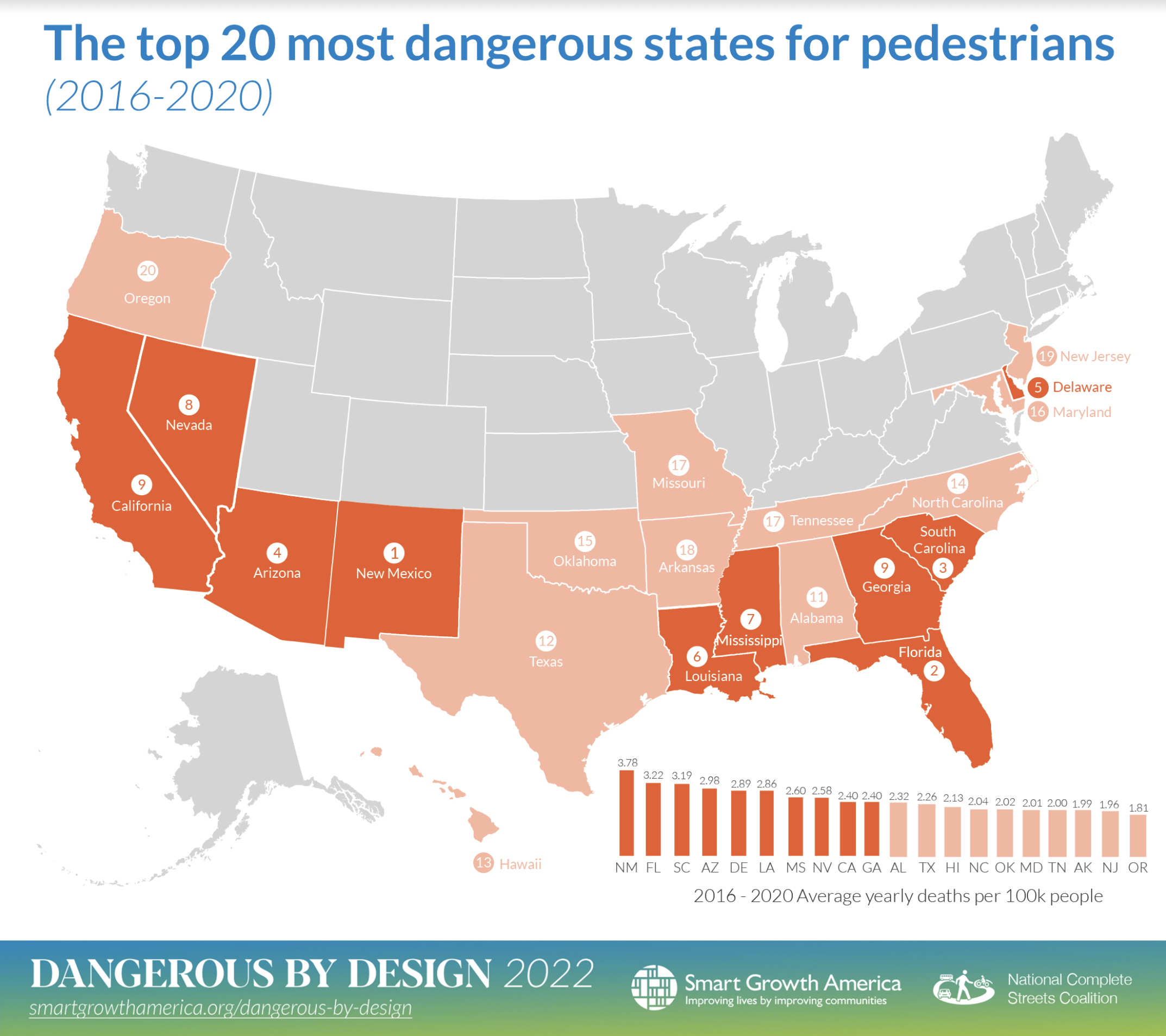 Thus, the 10 states that had the biggest gains in their rates of pedestrian fatalities during that period were, in order, New Mexico, Florida, Arizona, Delaware, Louisiana, Mississippi, Nevada, California, Alabama, and Texas.