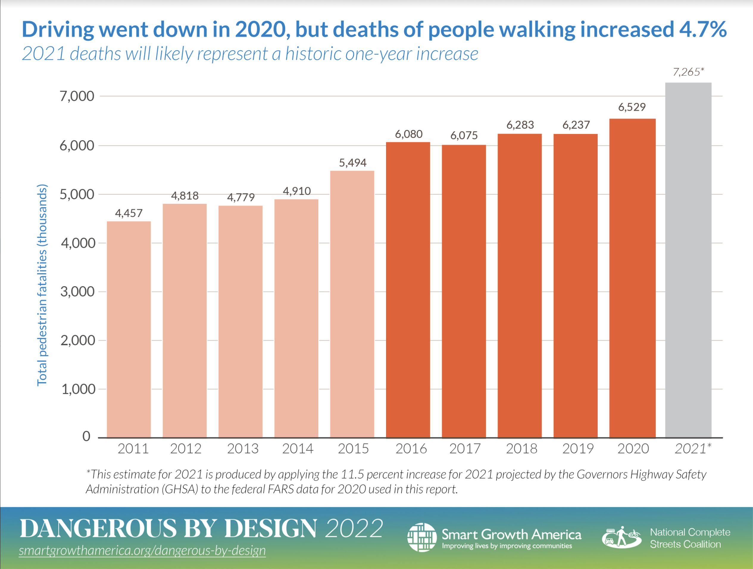 - A “jaw-dropping” 7,485 people walking were struck and killed in 2021, according to preliminary data — a rate between 11 and 13 percent higher than 2020, “the highest number in 40 years and one of the biggest single-year jumps in decades.”