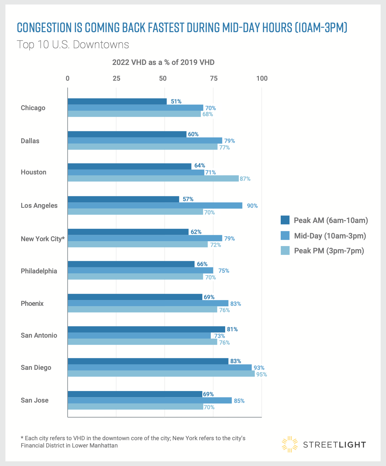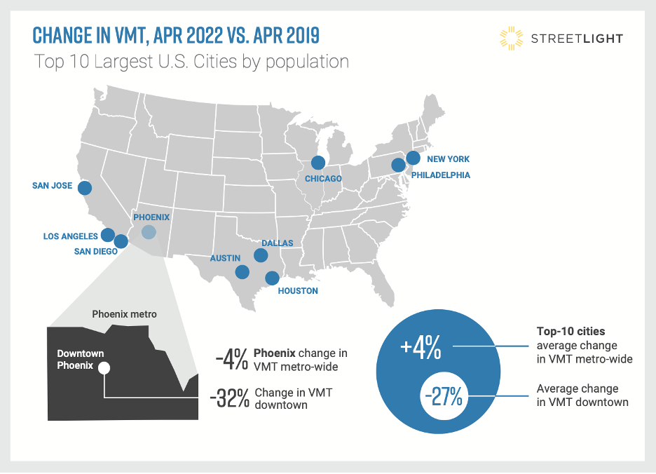 According to the transportation analytics firm Streetlight, the number of motorists driving through America’s 10 largest city cores in April 2022 was down a whopping 27 percent compared to the same month in 2019 — with some particularly car-dependent areas, like downtown Phoenix, experiencing as much as a 32-percent decline.